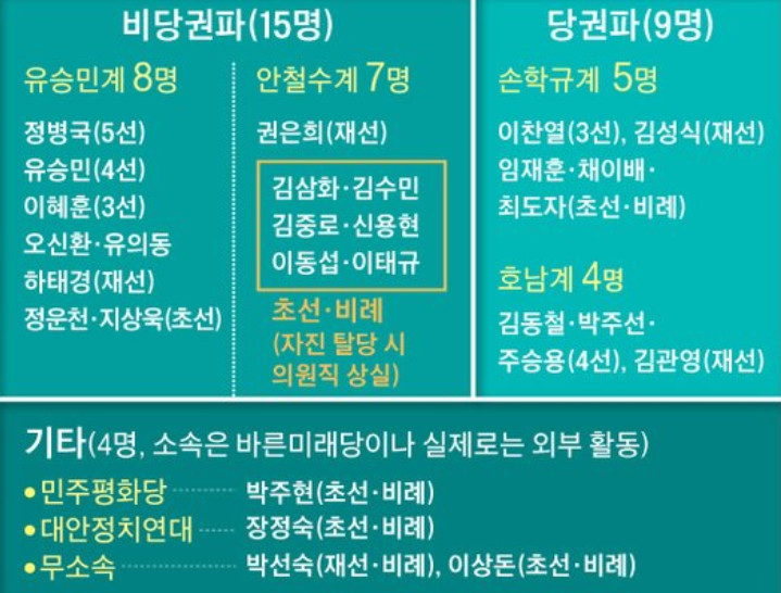 유승민 계 8명, 안철수계 7명 도합 15명이지만 권은희 빼면 자신 탈당시 의원직을 날려 묵는다
