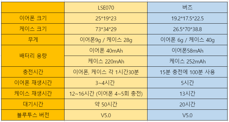 제일 궁금한 스펙을 한눈에 알 수 있게 많이들 생각 하시는 디자인이 비슷한 완전무선이어폰 삼성 갤럭시 버즈에 비교 해 봅니다