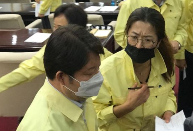 - 시 의회에 출석해 활짝 웃으면서 미래통합당 의원들과 기념사진을 찍고 있음.