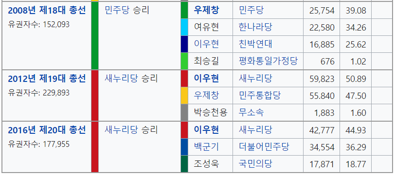 용인갑은 17대에는 민주당 계열이 18대는 보수 분열로 겨우 당선