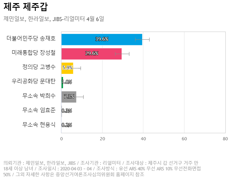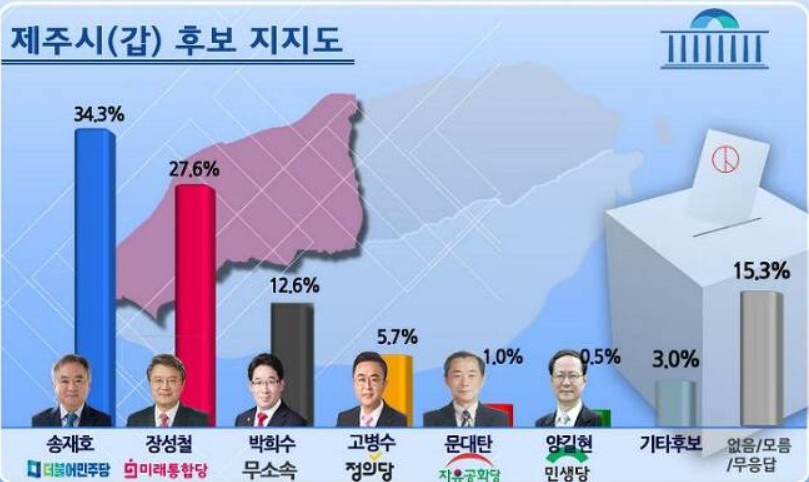 민주당을 탈당해 무소속으로 출마한 박희수 후보가 여권 표를 얼마나 잠식할 지와 아직 후보를 결정하지 못한 부동층의 선택이 제주시갑 후보들의 당락을 가르는 변수가 될 것으로 보인다.