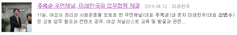 엄마부대가 아니고 그때 무슨 여성인권 단체였던 것 같은데요. 그것도 MOU라는 것은 그냥 어떤 좀 깊이 관계가 있을 때도 있지만 또 때로는 형식적일 때가 있어요. 그래서 저는 그 이후에 어떤 구체적인 사업이나 이런 것을 한 건 전혀 아니고요. 여러 분들을 만나는 가운데 한 분과 그런 사진을 찍었던 것-거짓