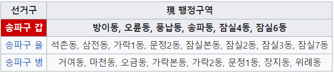 행정구역으로 보면 잠실4.6동, 방이,오륜,풍납,송파로 구성되어 있지