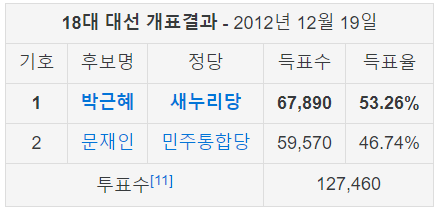 18대 대선에서 박근혜와 문재인 투표 비율은 9% 차이야
