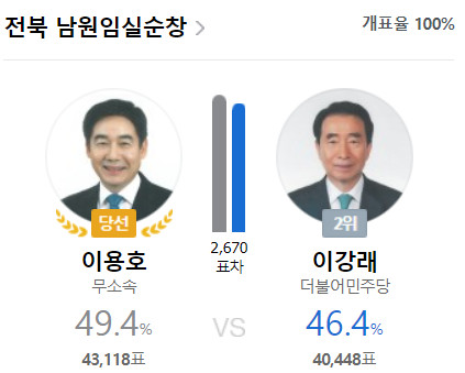 전북 남원임실순창의 이강래가 떨어지고 무소속 이용호가 당선되었어