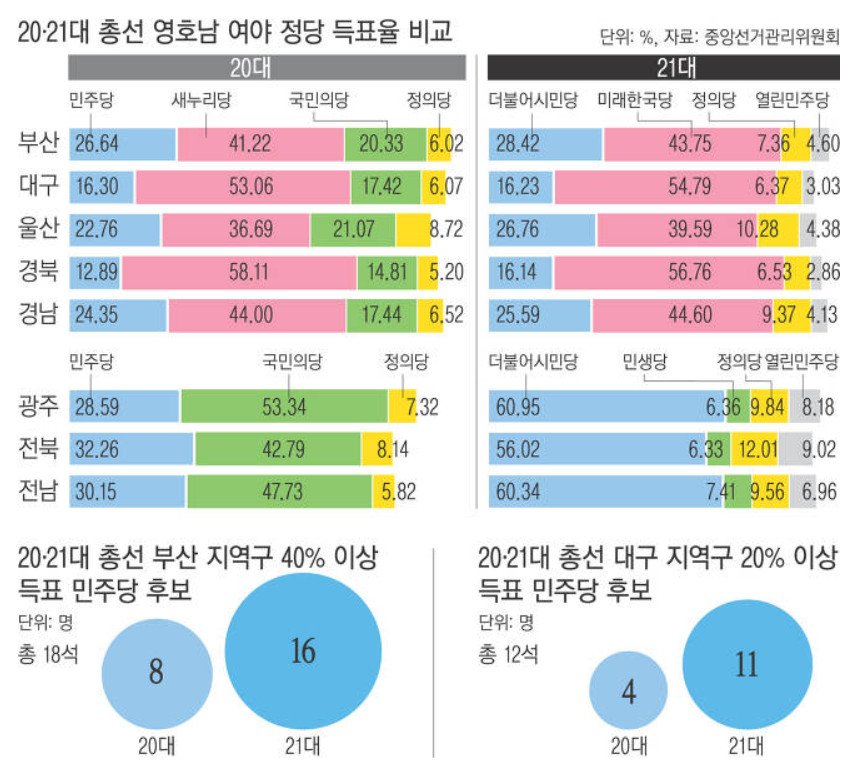 영남은 거의 핑크 물결로 만들어졌고 지역주의가 다시 회귀 했다고 하지 그런데 20대 총선에 비해 의석 점유율은 낮아 졌지만 진보 지지률은 올랐어 부산의 진보층 득표율이 44% 라고 한다 이 표는 대선에서 중요한 역활을 할 수 있겠지,