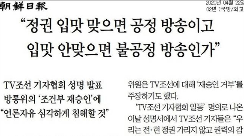당장 tv조선 채널 a의 조건부 재승인에 대해 조선 일보는 이러고 있어