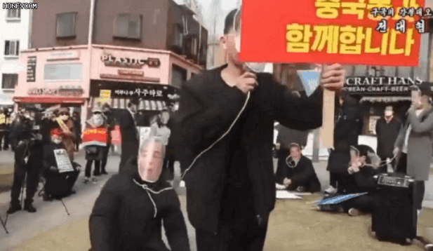 자국 대통령을 '중국의 개'로 비유하면서 중국 시진핑 주석이 우리나라 대통령을 목줄을 채워 개처럼 끌고 다니는 퍼포먼스를 하는 막장 패륜을 저지르는 극우의 행동을 한 인물이요 단체요