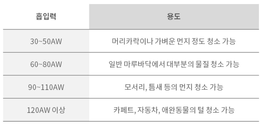 지금은 브랜드 제품들은 흡입력을 표시는 하는데 수입제품들은 그냥 모터 W로 비교만 하거던 없는 것도 많아