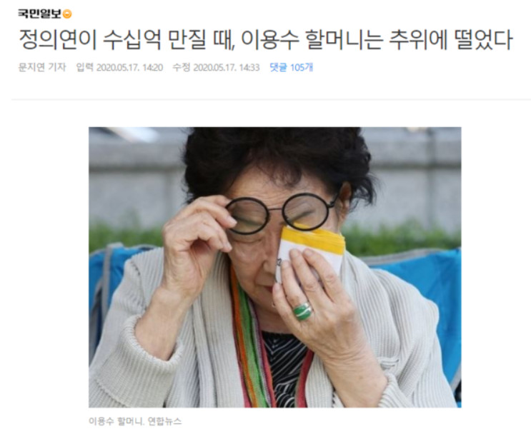 국민일보는 5월 17일 인터넷판에 “정의연이 수십억 만질 때, 이용수 할머니는 추위에 떨었다”는 기사를 올렸는데