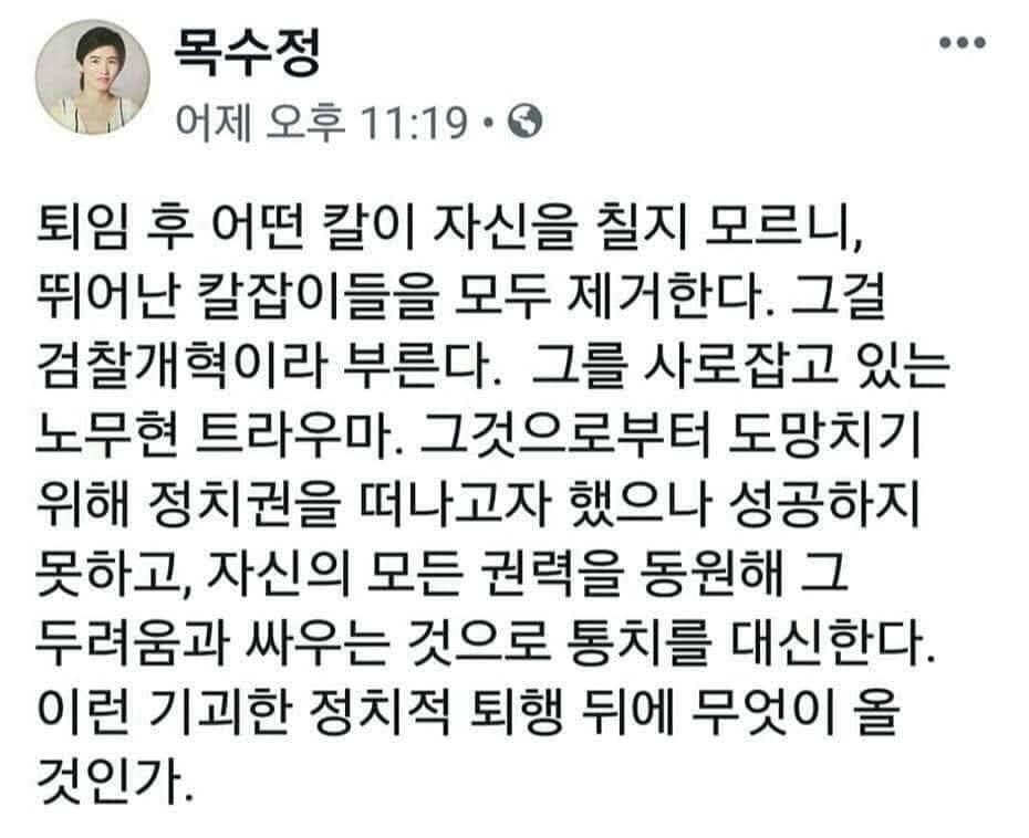 목수정 글들이 이상하게 변한지는 좀 오래 되었던 것 같아 천천히 좀 이상하게 글이 변하더니 요즘은 완전히 맛이 갔어, 다른 걸 떠나 뭘 주장하는지를 모르겠더라, 이번 코로나에 대한 글을 보면 더 그래....