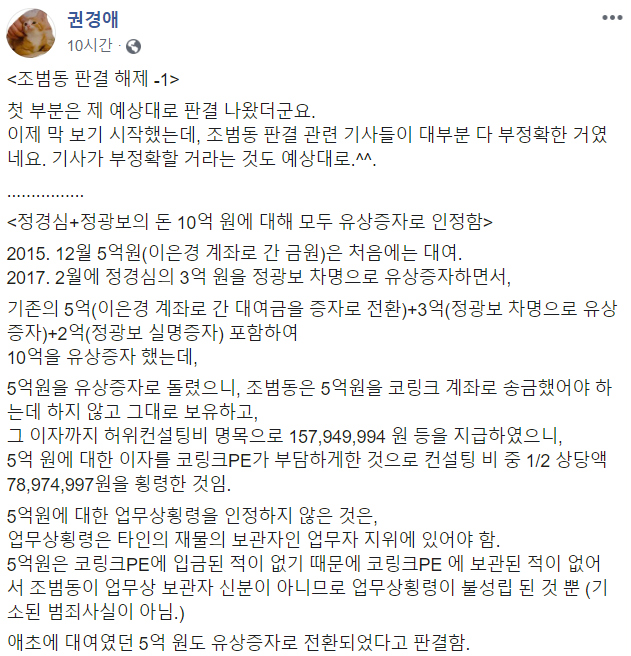 이번 조범동 판결에 대해 정경심교수와 동생이 10억 보낸게 유상증자라고 본인말이 다 맞았다는식으로 정신승리 하고 있는데