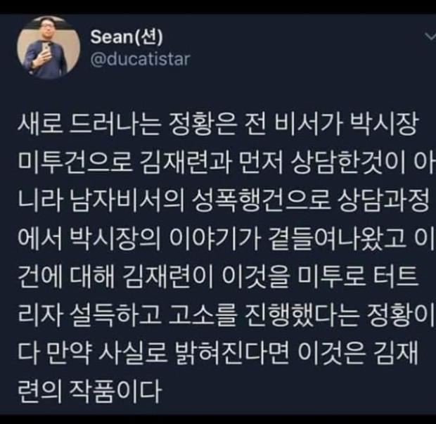 올 4월에 비서실 회식 후 수행비서가 만취한 여자 비서를 성폭행 건으로 김재련 변호사와 상담 중에 박원순 시장으로 넓혔다는 말이 있다