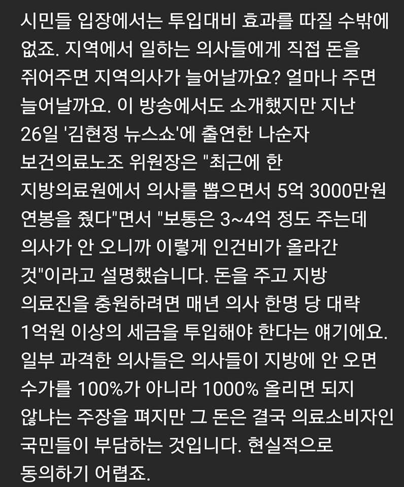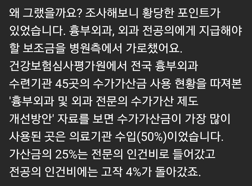 핵심을 봐봐 , 기피과에 대한 수가 조정이 우선이고 공공병원의 인프라가 먼저라고 외치지만 이들도 알아, 2009년 인가 외과 수가 지원을 정부가 해 주었지만 그걸 다 먹은게 병원이었다는 것을, 그게 표면에 나왔던게 이국종과 아주대 싸움이야
