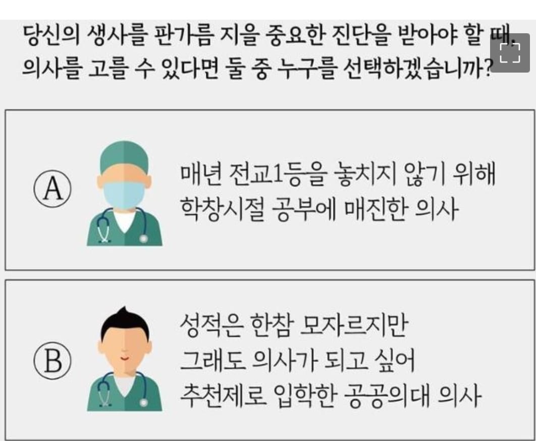 같은 돈 내고 서울대 연세대 고려대까지만 허용해야지 그 밑으로 전교1등도 아닌 의사에게 어떻게 진료를 받을 수 있냐....