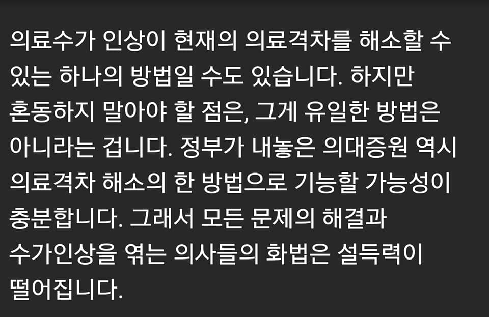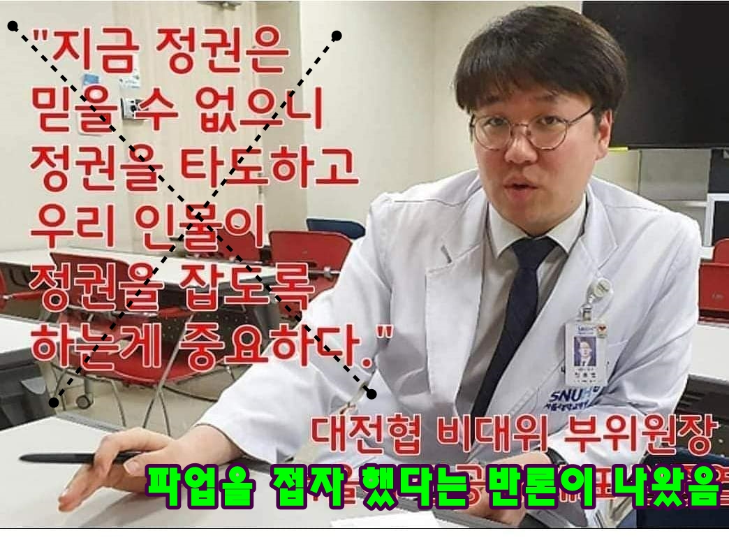 대전협 비대위 부위원장이자 서울대 전공의 대표 김중엽 이 사진과 글이 떠도는데, 저 글 내용과는 반대의 주장을 했다는 반론이 나왔다.