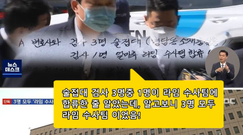어랏!!! 그런데 술접대 3명 중에 1명이 아니라 3명 모두 라임 수사팀이란걸 MBC가 밝힘. 이건 뭐 수사 의지 1도 없을게 뻔한걸 알려 주는거다. 즉 검사 놈들은 다 기획하는 것에만 몰두 했을 거라는게 뻔하다.