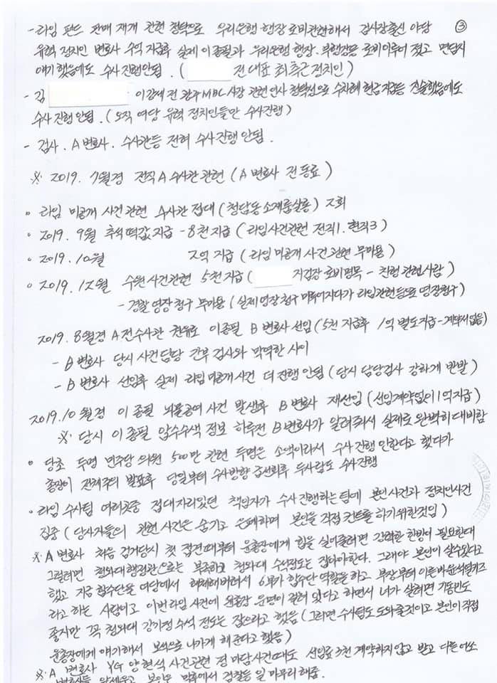 그리고 A 전 검사출신 변호사의 (이주형 전 검사입니다) 동료 A 전 수사관이 (이름 모릅니다.) 2019년 12월 "윤대진 지검장 로비 명목으로" 5천만원을 가져갔다는 것입니다. 이른바 윤석열의 대윤, 소윤할때 소윤 윤대진 이름이 가려진 것입니다. 이게 김봉현의 폭로 문건 3쪽의 실명입니다.