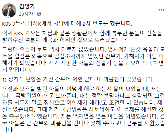 글 솜씨가 좋지 않아 논리정연하게 쓰진 못했지만 조금이나마 김병사와 김병기의원에게 위로가 되었으면 하는 마음에 이렇게 몇 자 적어봅니다.