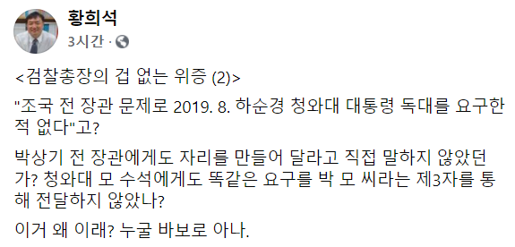 자신은 “만약에 여기서 (조국 후보자가) 사퇴를 하면 좀 조용해져서 일처리 하는데 재량과 룸이 생길 수 있다” 고 했다