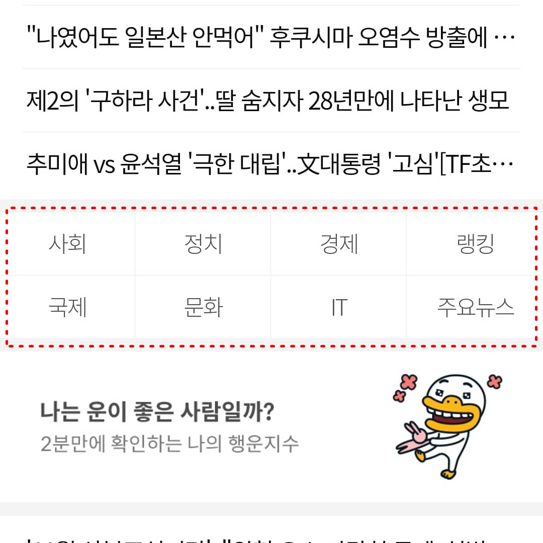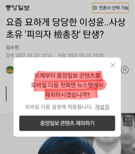 이 기능이 메인 화면에만 적응이 된다. 그러다 보니 메인화면 뉴스 클릭하고 다 읽은 뒤에 밑에 따라 붙는 뉴스를 클릭 해 보면 조중동이 클릭이돼.