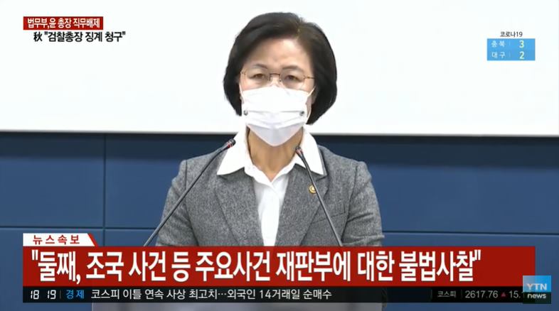 추미애 법무부 장관은 그냥 못 넘어간다고 바로 징계청구 및 직무집행정지 명령을 내리고 감찰 과정까지 자세히 알림.