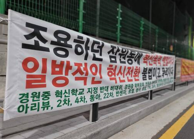 경원중 재학생 학부모모임'이란 명의 말고도 "신반자, 아리뷰 2차 4차, 동아 22차, 반센자, 르엘, 청구, 한신 7차 26차, 로얄 입주자대표협의회"란 글귀도 적혀 있다. 학부모뿐만 아니라 주변 아파트 거주자 대표들까지 혁신학교 반대운동 하는데 그 이유는 누구나 다 안다