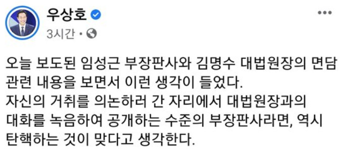 이에 젊은 판사는 둘다 잘못인데 녹취한 임성근 판사의 행위에 대해 좀 더 쎄게 질타를 하고, 부장판사들은 녹취는 거론하지 않고 거짓말 한 대법원장 문제만 거론하는 모습을 보이고 있어, 이건 둘 다 문제가 정답이라고.