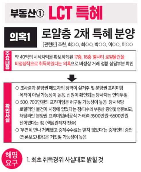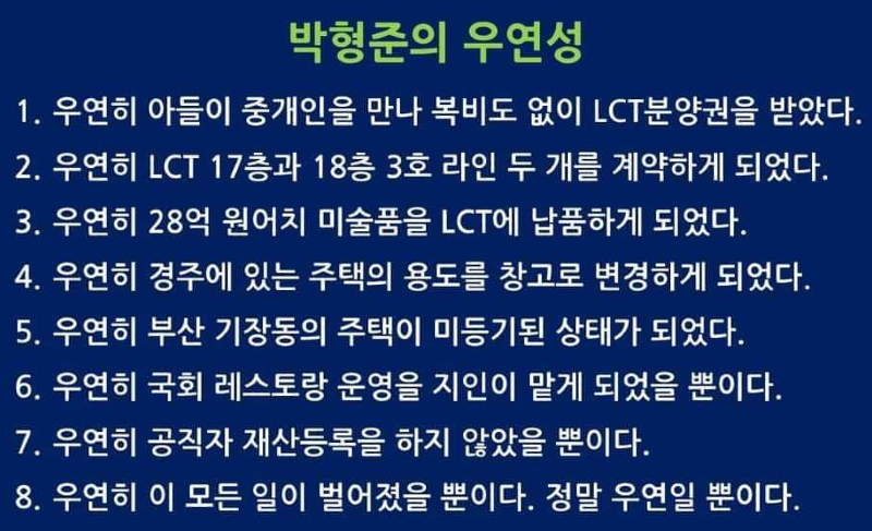 처음에는 엘시티에 살고 있지 않는 것처럼 살고 있는 집 주소지도 조현화랑으로 등록. 그러다가 걸리니 '정상적인 매매였다'면서 주소지 변경. 아들과의 거래라는 것이 드러나자 '평생 살 집'. 그런데 평생 살 집을 비워두고 있다가 3월 초에 급하게 들어감. ( 참 할말없음 )