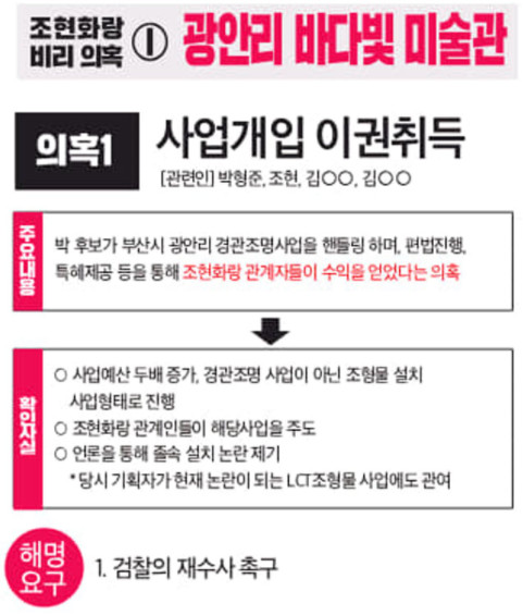이 모든 사업에 박형준 후보의 처 조현 씨(조현화랑 대표)가 관여됐다란 의혹이 있다.- 열린공감tv