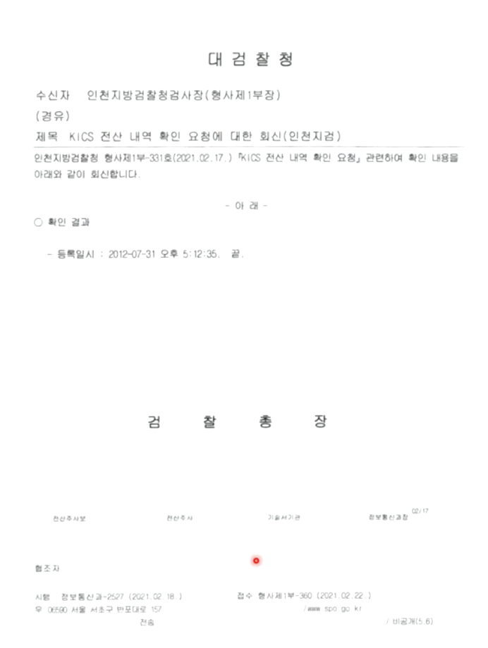 첫번째 받은 서류다. 검찰총장 직인과 수사 담당자 이름도 기재돼 있지 않은 조잡한 형태, 다시 청구한다