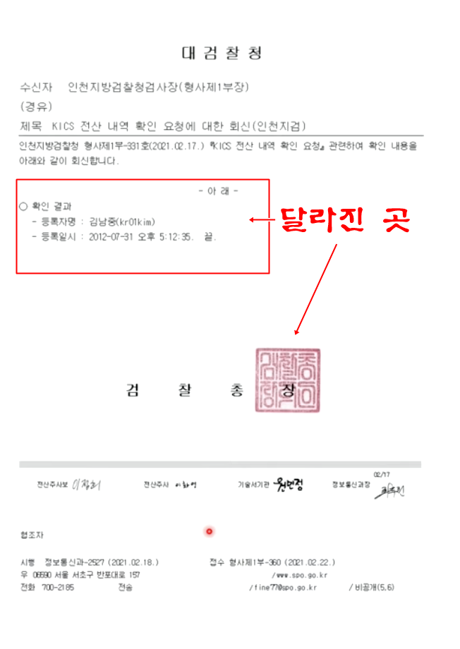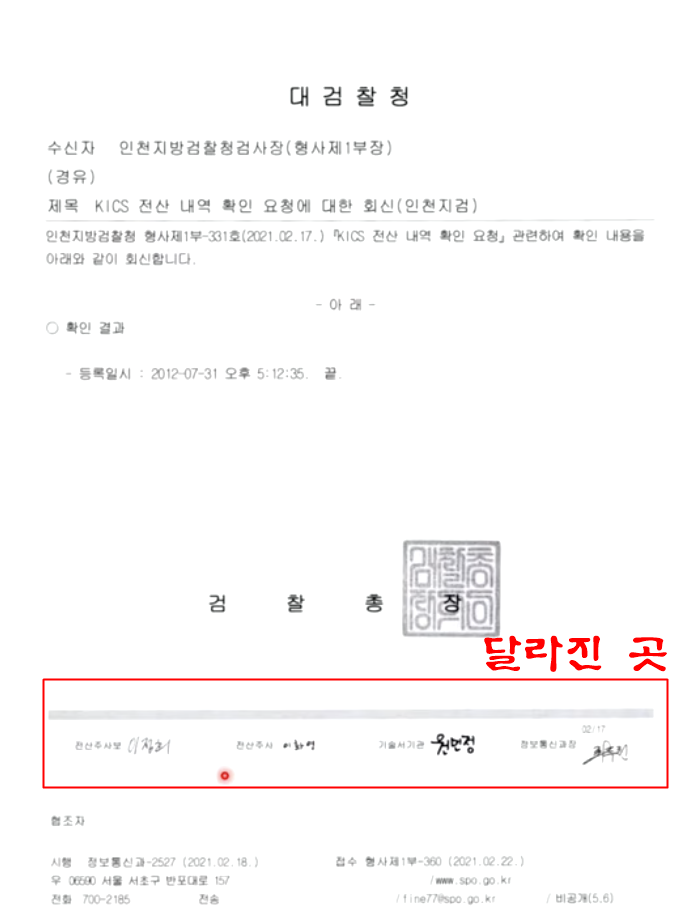 이것은 사문서가 아니라 공문서다. 공문서 위조는 더 강력한 처벌을 받게 되지. 수사관 이름을 숨기기 위해 공문서를 조작한 의혹이 첫번째다. 대검 공문의 변조를 위해 검찰총장 직인 이미지 파일도 위변조해 사용한 것으로 추정된다.
