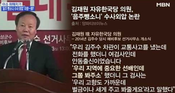 김주수 의성군수가 음주뺑소니를 했는데 그걸 김재원이 검사에게 청탁을 했고 그 검사는 청탁대로 봐줬음을 자기 입으로 자랑했다는 것이다 영상까지 있어