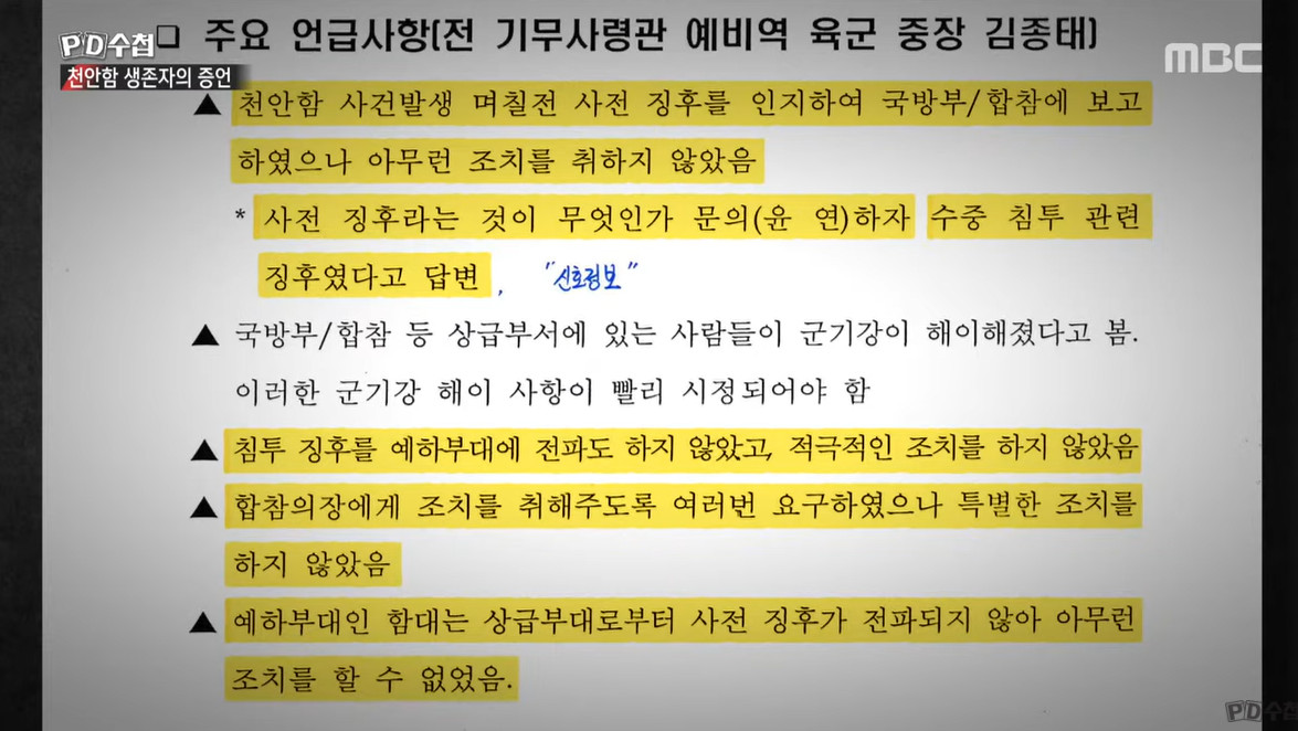 2. 생존자증언이라고 하지만 그들의 심적인 것을 보여 주는 것이고 중요한 것은 최원일함장이 가진 문서, 기무사령관이 보고한 것을 국방부장관이 뭉갰다는 점이 가장 큰 문제라고 본다.