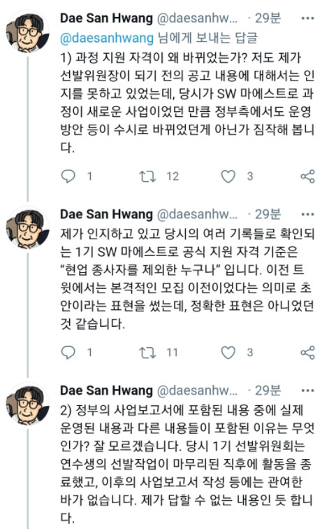 1. 정부 공고문은 초안이라고 해 버리고 각 대학 그리고 커뮤니티 공고문 보고 온 이들이 태반이라는 말을 한다. 어느 동네에서 정부 공고문 보다 대학과 커뮤니티에 올린 공고문이 맞다는 것인지 또 그게 다르다는 뉘앙스를 해 버리는 실수. 내부지침이 따로 있었다는 뉘앙스는 공고와 다르게 마음대로 뽑았다고 볼수 있는 글을 남겼다.