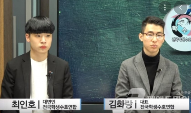 반일 구호 외치게 했다고 정치적 편향을 가르친다고 반발 했던 전국학생수호연합의 김화랑과 최인호.