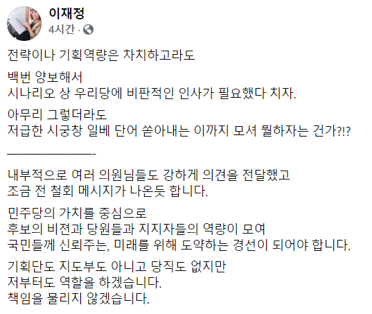 지금 민주당 지지자들 마음은 이재정 의원이 확실하게 표현을 해 주었어