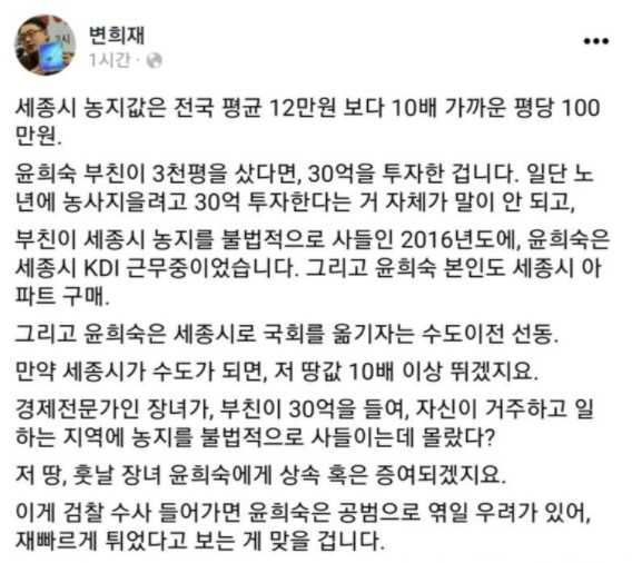 ♨ 즉 이건 윤희숙이 했던 동생 남편이 했던 정부를 이용해서 산 것으로 의심이 안 갈수가 없어, 그러니 발등에 불이 떨어진 형국이 된거지.