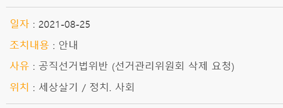공직선거법 제82조의4 제3항에 따른 중앙선거관리위원회로부터 삭제(또는 그 취급의 거부․제한․정지)요청이 있어, 귀하가 작성한 게시글이 삭제(또는 그 취급의 거부․제한․정지)되었음을 알려드립니다.