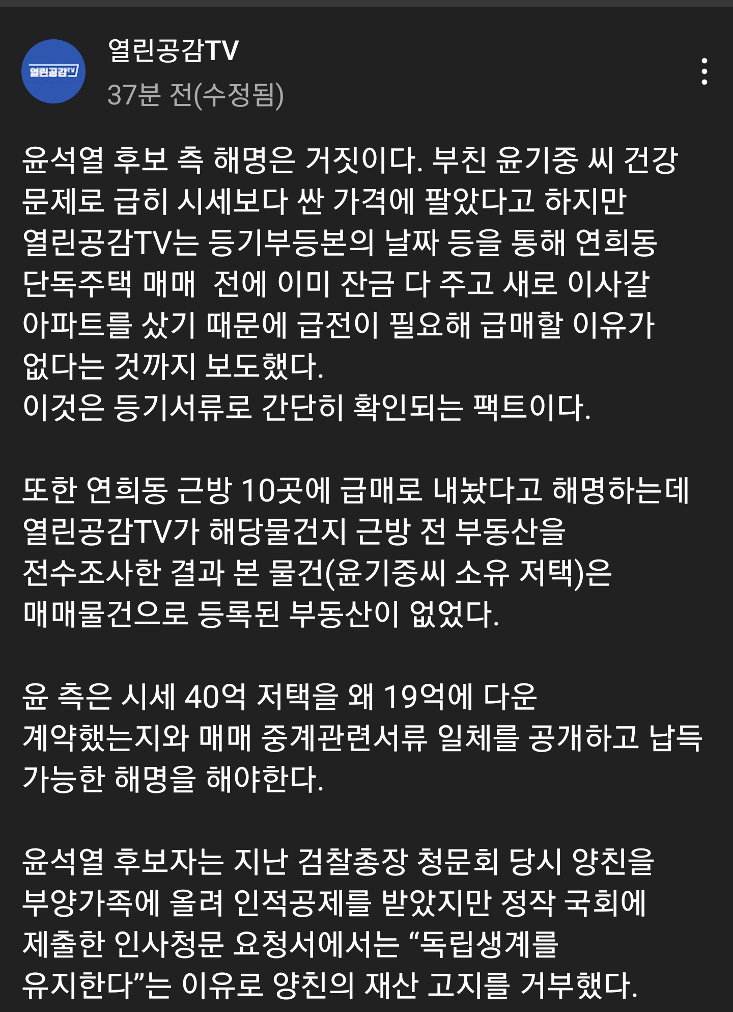 윤석열은 부친 건강상 문제로 시세보다 싸게 급처분 했다고 이야기를 하는데 과연 그럴까?