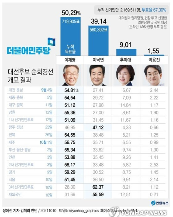 이재명 71만9905표 50.29% 민주당 대선후보 확정