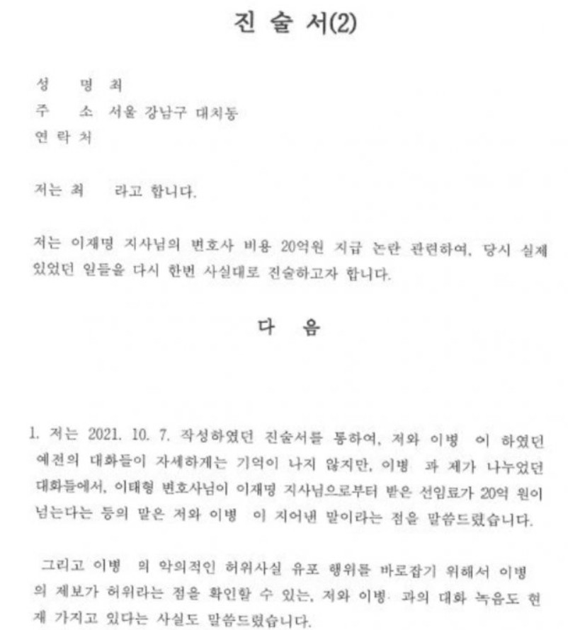 최씨는 진술서에서 “제가 나누었던 대화들에서 이태형 변호사님이 이재명 지사님으로부터 받은 선임료가 20억 원이 넘는다는 등의 말은 저와 이병철이 지어낸 말”이라고 확인했다.