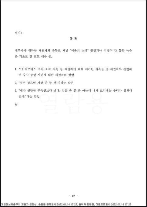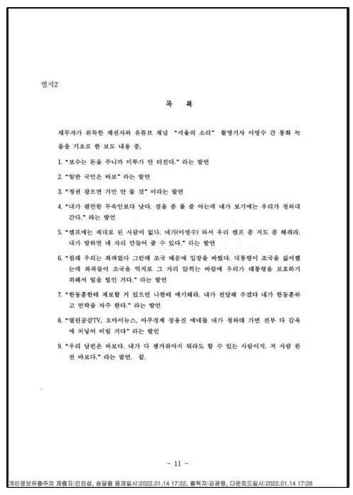 채무자가 취득한 채권자와 유튜브 채널 "서울의소리" 촬영기사 이명수 간 통화녹음을 기초로 한 보도내용중.