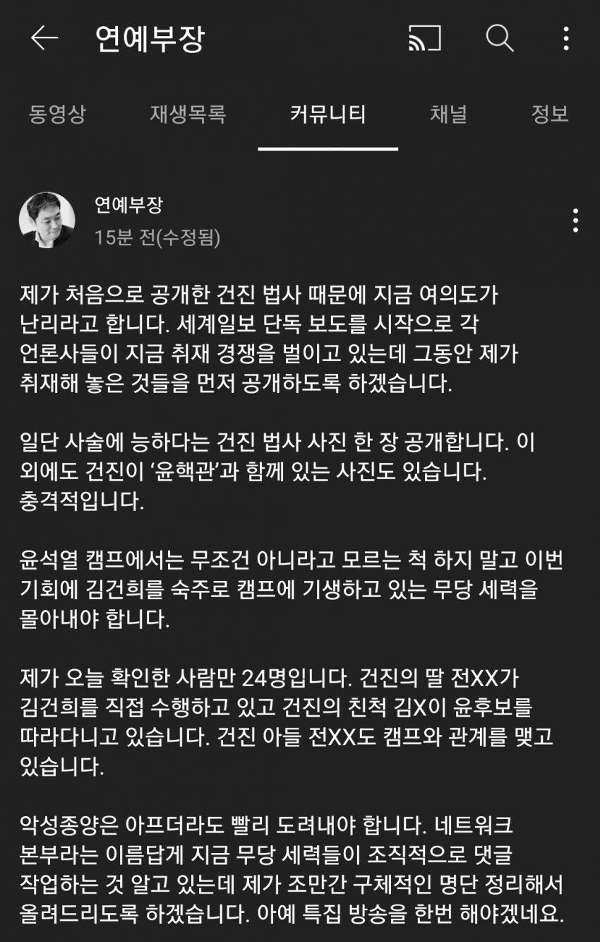 작년부터 파일 대부분 다 들었습니다만 지금 소설처럼 퍼지는 얘기들은 그냥 소설이구요, 진보진영쪽에선 대부분 눈치채고 있는 '김건희'라는 여성의 캐릭터가 드러나는 정도로 생각하시는게