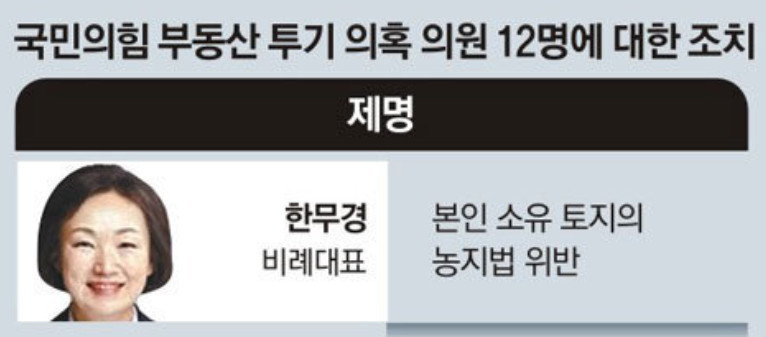 2004년부터 2006년 사이에 강원 평창군에 농지 총 32필지, 약 11만 m²(3만3275평)에 달하는 대규모 땅을 구입한 뒤 경작을 하지 않아 농지법 위반으로 굿힘당에서 제명 당했었다고.