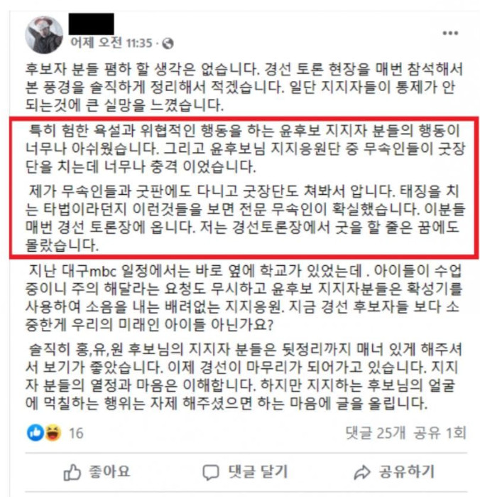 홍준표와 경선 할때는 무속인을 동원, 살을 날렸다는 글도 있었음