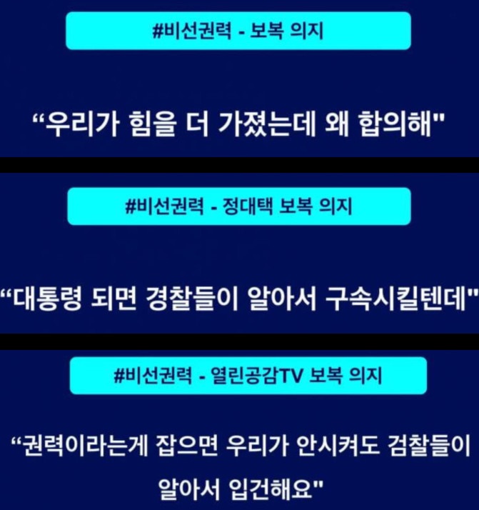 자신들이 권력의 자리에 오르면 검찰과 경찰은 알아서 길것이고 그럼 자연스럽게 보복완료라는 생각을 가지고 있습니다.