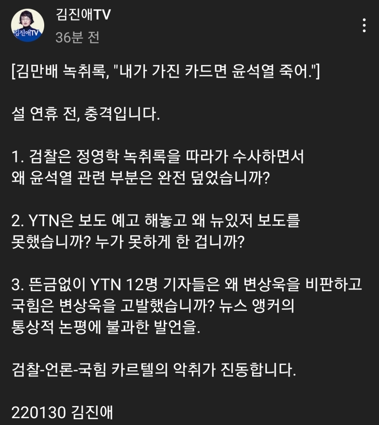 | 김건희 욕 7시간 전화 녹취록3/ 🦜끼,🦜끼 / 검찰과 법원은 김건희 손안에 있나?/열린공감tv (0) | 2022.01.30 |