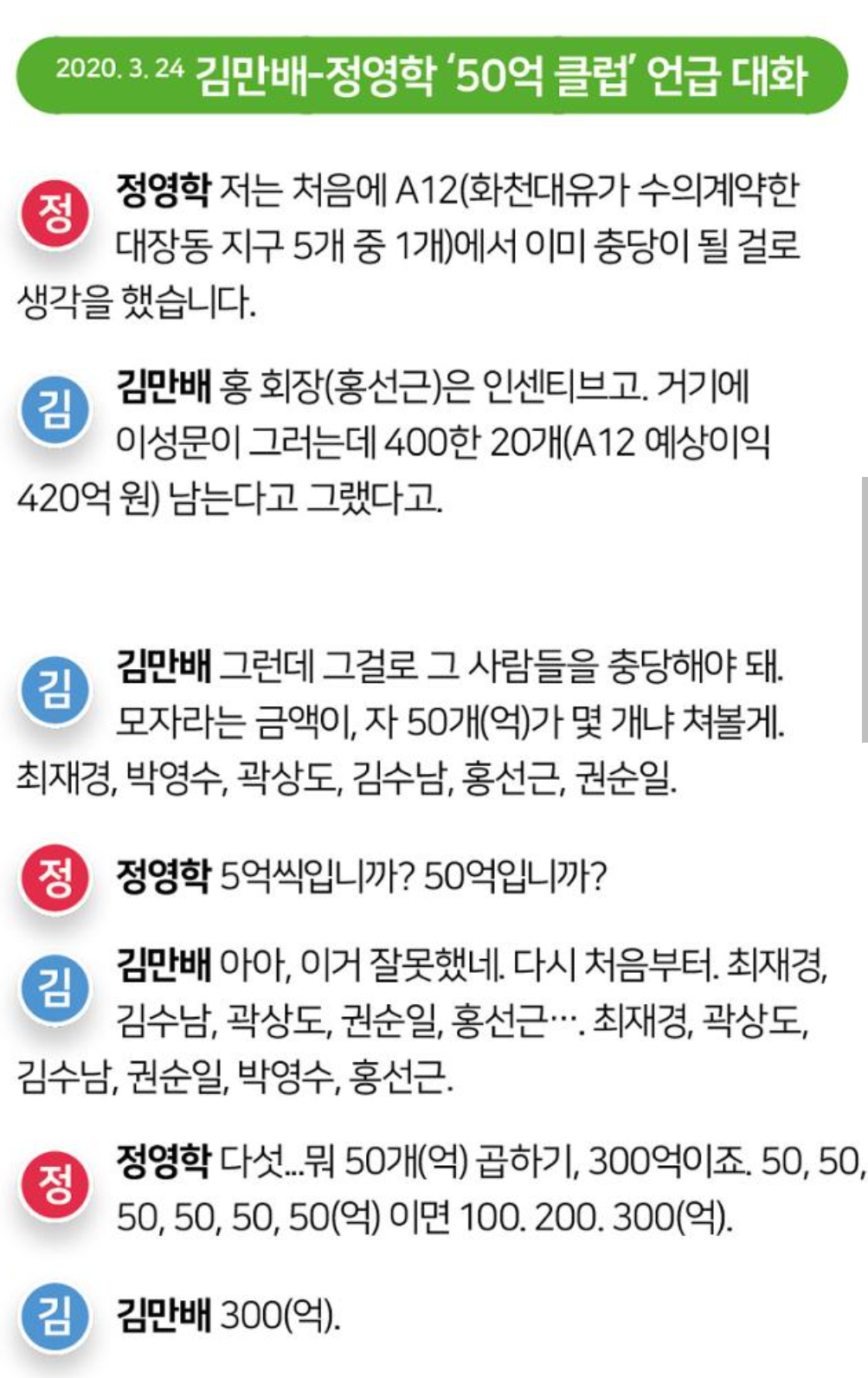 여태 천화동인5호 소유주 정영학(54) 회계사가 2019년부터 2020년까지 김씨와 나눈 대화를 녹음한 녹취록에서 이미 알려진 50억클럽 언급 대화를 보자.