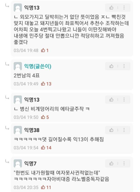 평생 여자 못만날듯 여자들은 그런 애들 못생겨서 맨날 숨참음 ㅠ 이런식으로 공격했는데
